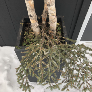 I usually separate my piles of cut greenery into short pieces and long pieces. I use the long pieces first to start the bottom layer of the planter, filling in so that you cover the soil (or snow) and the lip of the planter entirely. Then I use my short pieces to fill in the gaps making it look full.